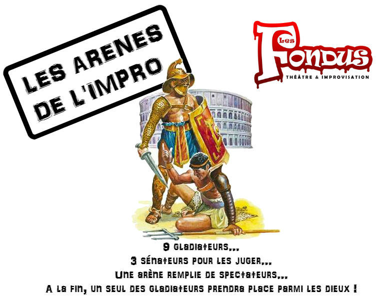 Les arènes de l’impro est le spectacle d’improvisation le plus populaire de la scène aixoise. Il se situe à la frontière du catch d’impro, de l’impro chapeau et de la scène ouverte. Chaque improvisateur, quelle que soit sa ligue, peut venir jouter dans l’arène pour tenter de rejoindre les dieux de l’Olympe !