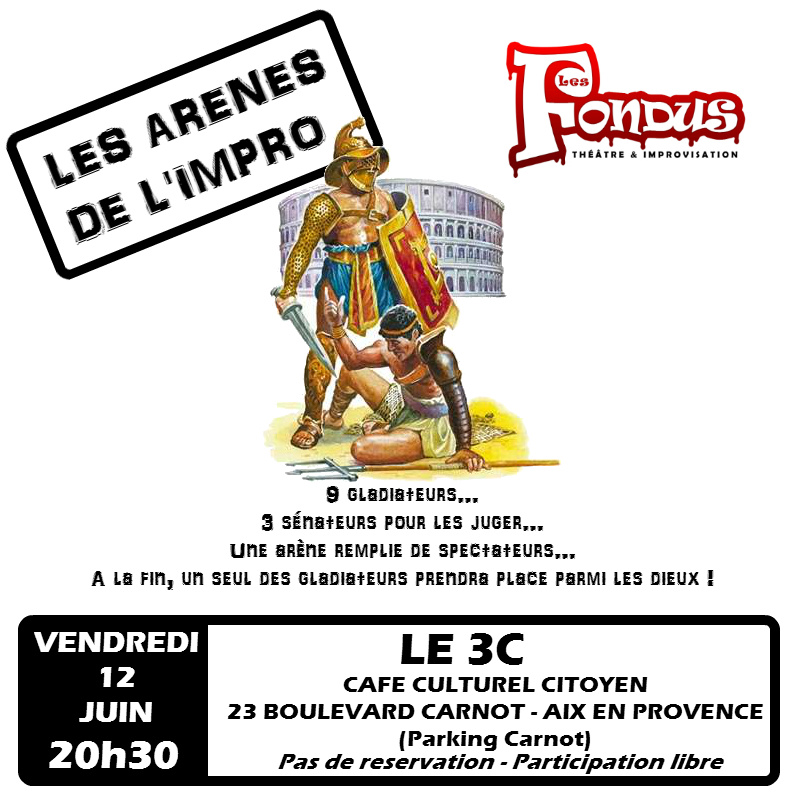 affiche arenesTout d’abord, comme tous les seconds vendredis du mois, vous aurez le plaisir d’assister au spectacle d’improvisation le plus populaire d’Aix en Provence, celui qu’on ne présente plus : les arènes de l’impro.