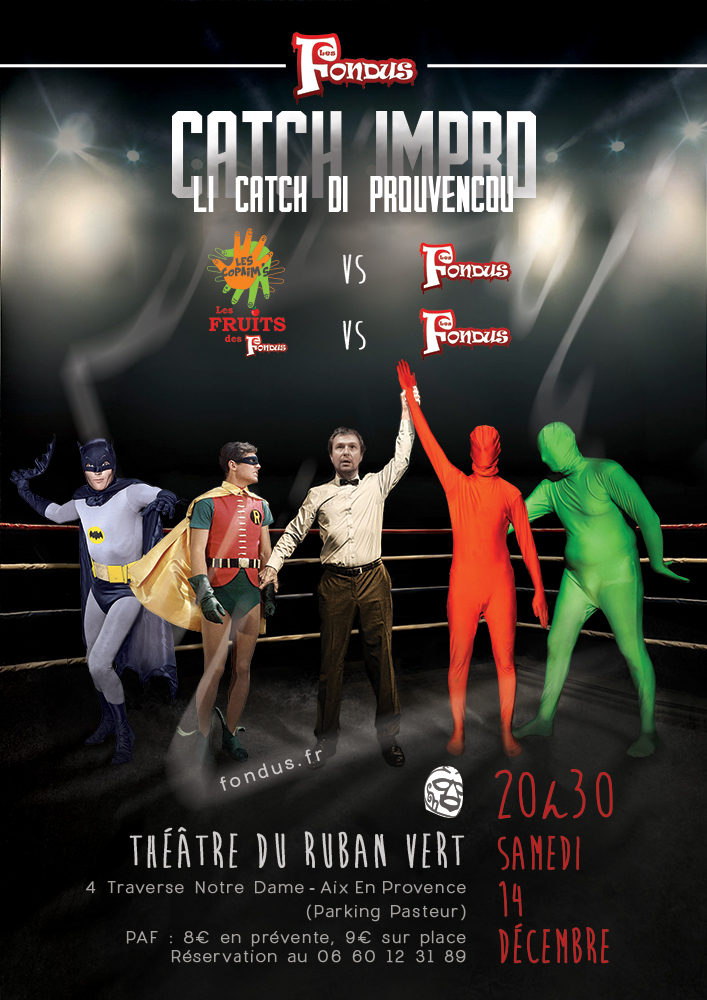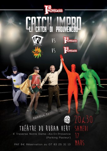 catch1decembre2018La saison 2018/2019 du célèbre championnat régional de catch d’impro commence pour les Fondus. La compétition, démarrée le 25 octobre à Toulon, sera organisée à domicile par les Fondus le 1er décembre au Ruban Vert à Aix-en-Provence.