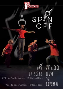 Les semaines chargées s’enchaînent chez les Fondus. Encore deux nouveautés cette semaine. Un nouveau spectacle à la Scène ce jeudi, Spin Off, et une invitation pour ouvrir le superbe festival de théâtre de Pertuis, les Dionysies, vendredi.